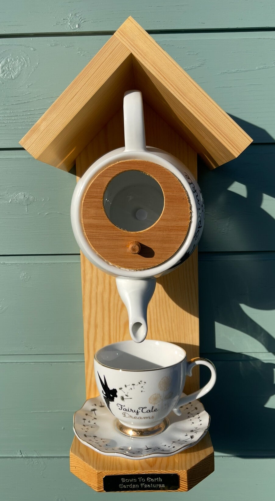 Tinkerbell teapot set garden feature bird house / bird feeder, wood stain finish