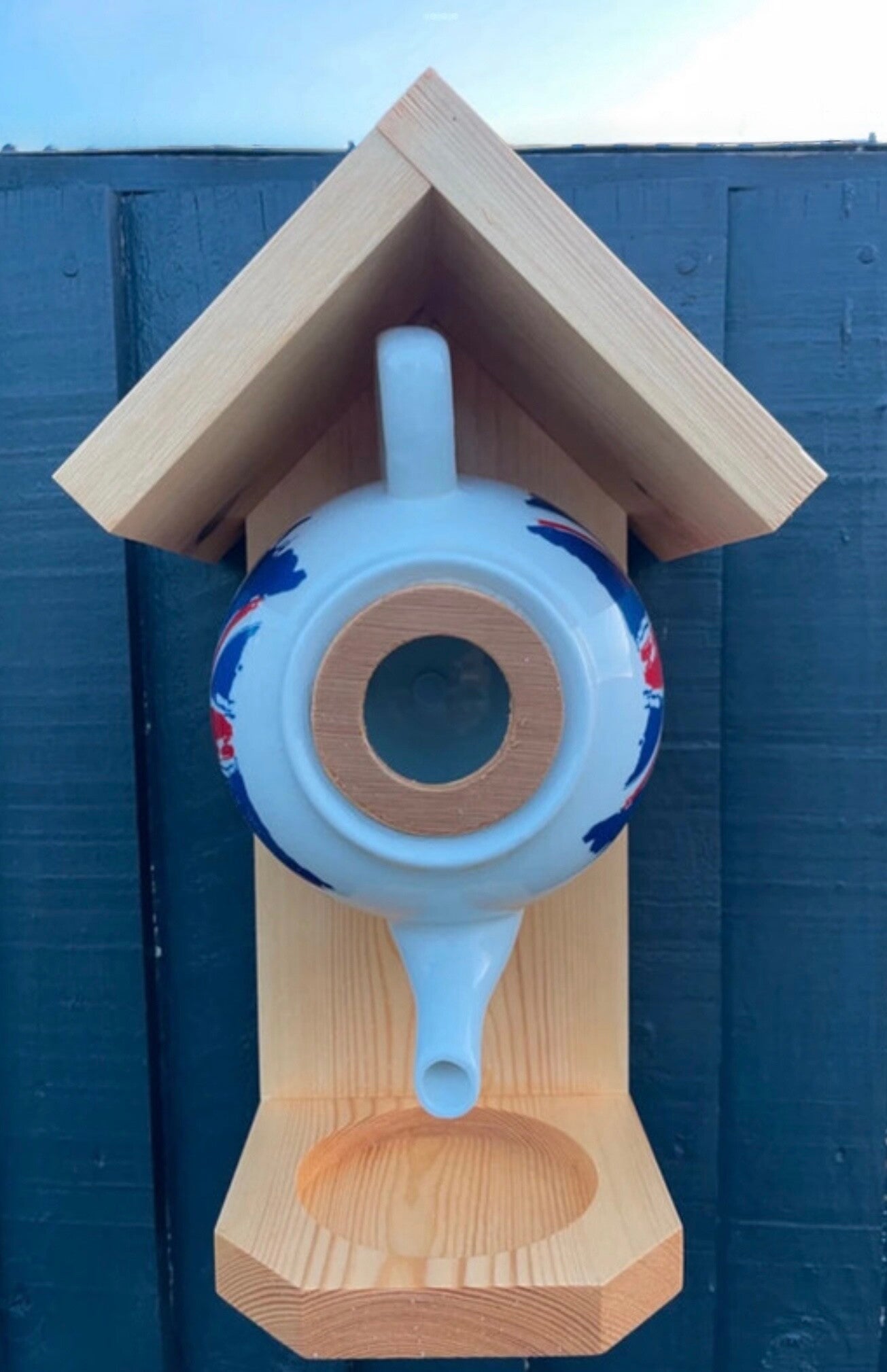 Featuring a Union Jack themed teapot with wood finished in a beautiful wood stain creating a cozy retreat for birds and food from the trough.