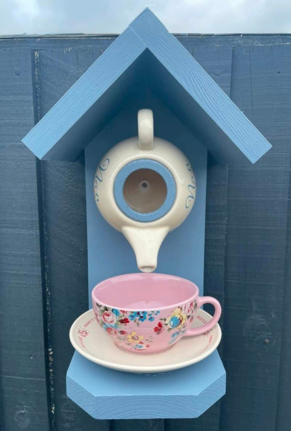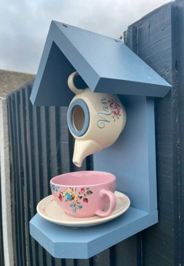 Featuring a nan themed teapot set with wood finished in a beautiful cornflower paint colour creating a cozy retreat for birds and food from the cup.