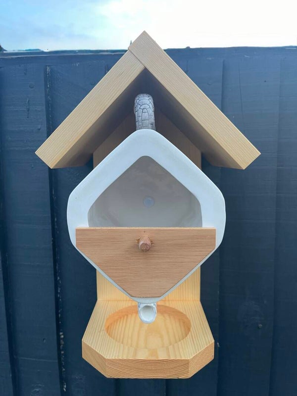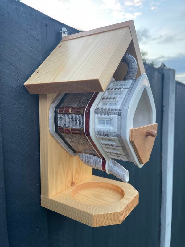 Featuring a Queen Victoria pub themed teapot with wood finished in a beautiful wood stain creating a cozy retreat for birds and food from the trough.