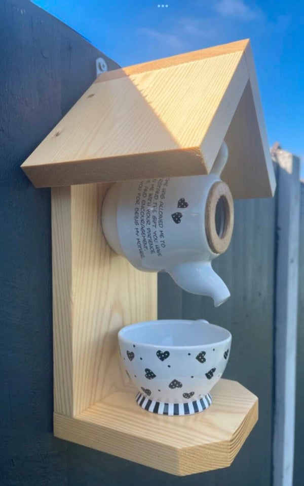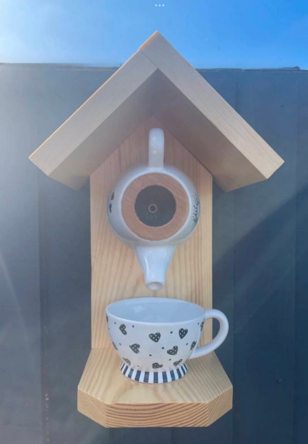 This handcrafted bespoke teapot set garden feature bird feeder is a charming addition to any garden.