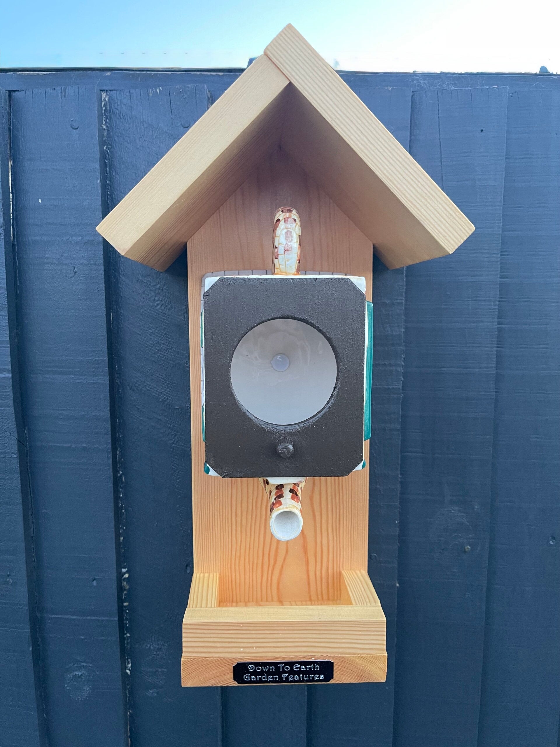 Featuring a Rovers Return pub themed teapot with wood finished in a beautiful wood stain creating a cozy retreat for birds and food from the trough.