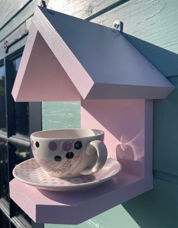 Featuring a floral themed set with wood finished in a beautiful sweet pea paint colour creating a cozy retreat for birds and food from the cup.