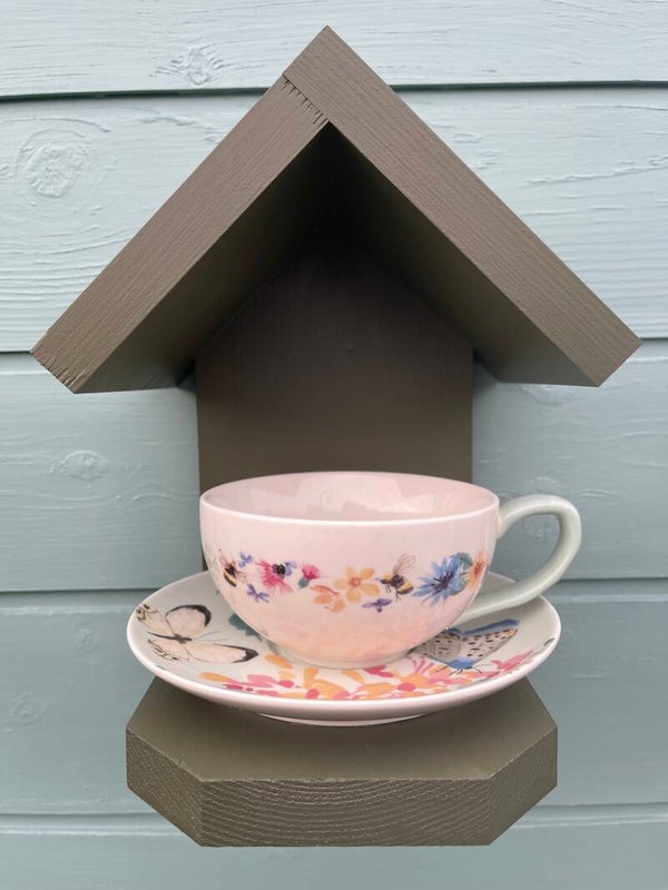 Bees and butterflies teacup & saucer garden feature bird feeder