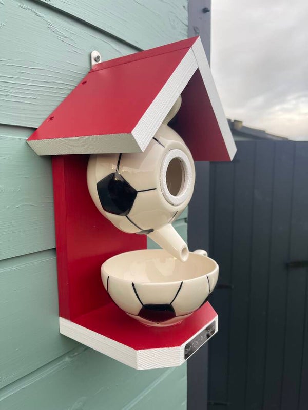 Featuring a football themed teapot set with wood finished in beautiful red and white paint colours creating a cozy retreat for birds and food from the cup.