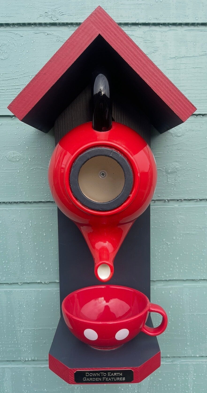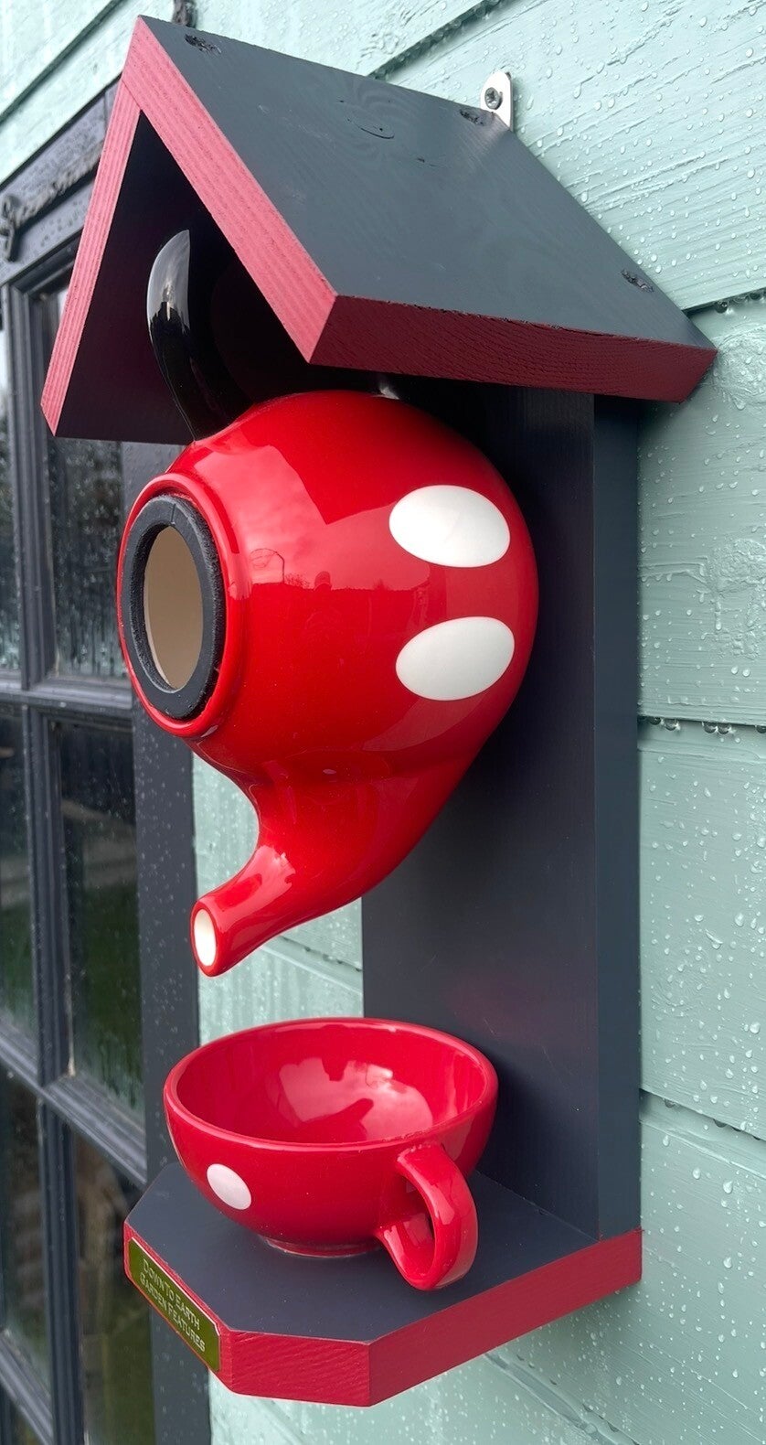 Featuring a Mickey Mouse themed teapot set with wood finished in beautiful urban slate and Moroccan red paint colours creating a cozy retreat for birds and food from the cup.