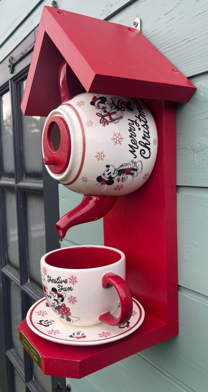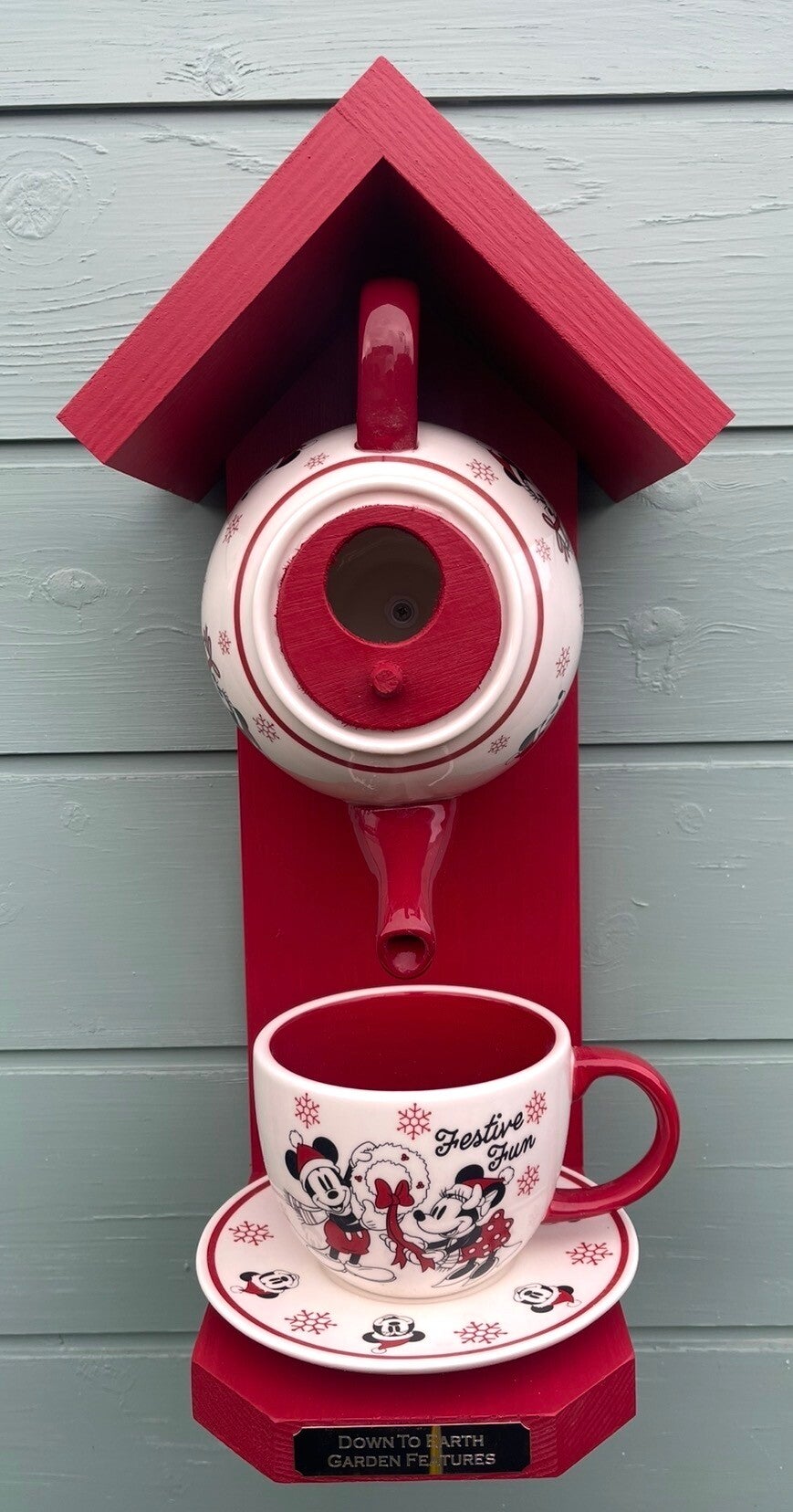 Featuring a Mickey and Minnie Mouse themed teapot set with wood finished in a beautiful red paint colour creating a cozy retreat for birds and food from the cup.