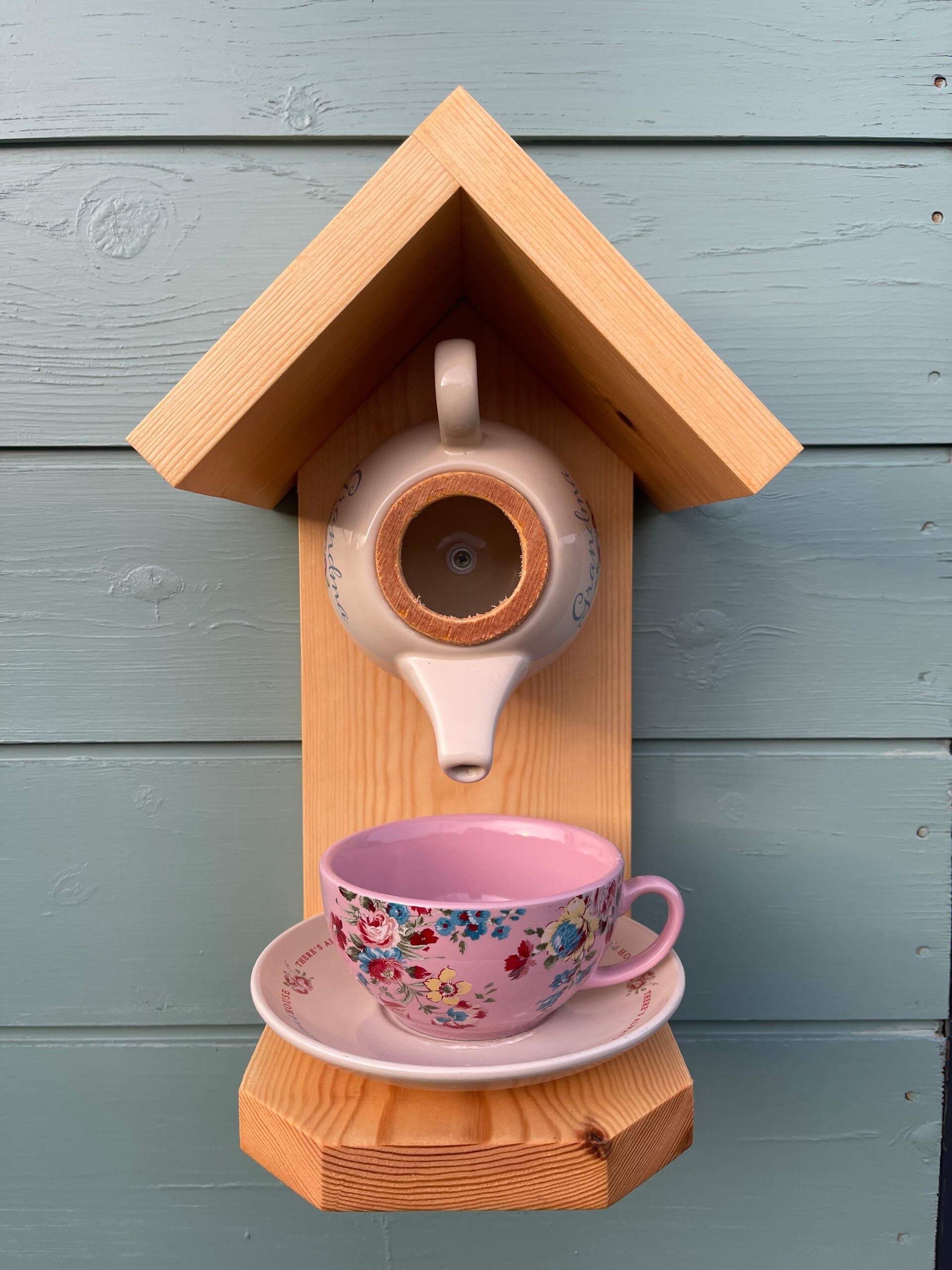 This handcrafted bespoke teapot set garden feature bird feeder is a charming addition to any garden.