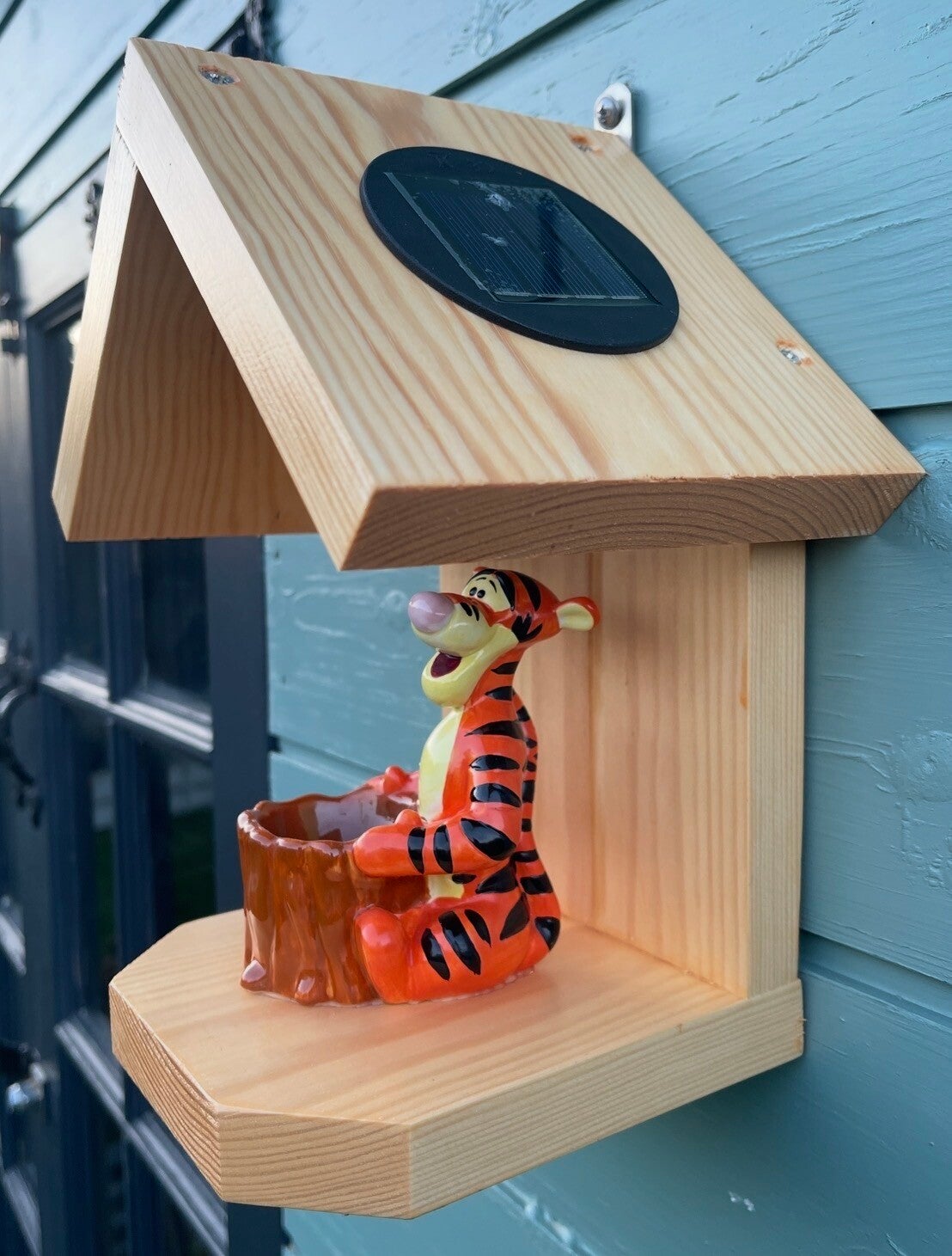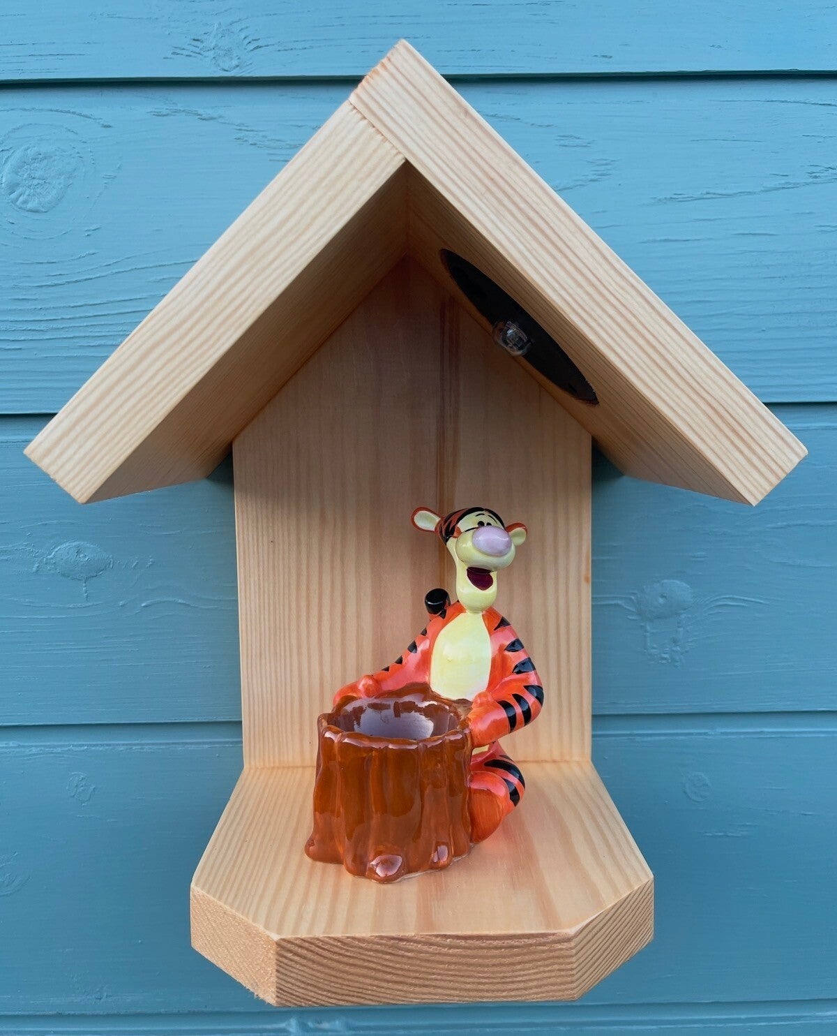 Featuring a Tigger themed ceramic egg cup with wood finished in a beautiful wood stain creating a cozy retreat for birds and food from the egg cup