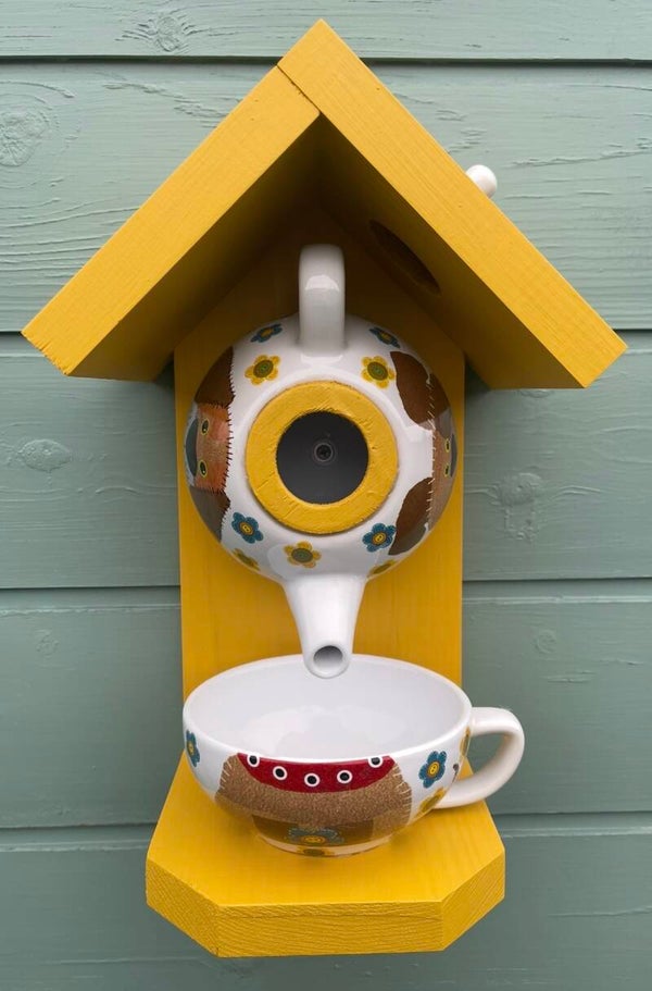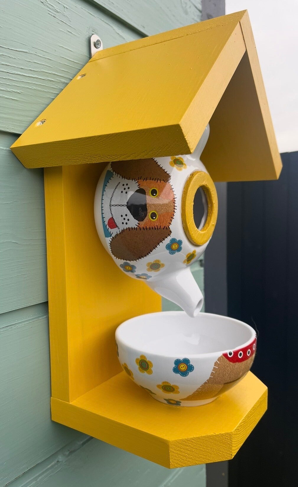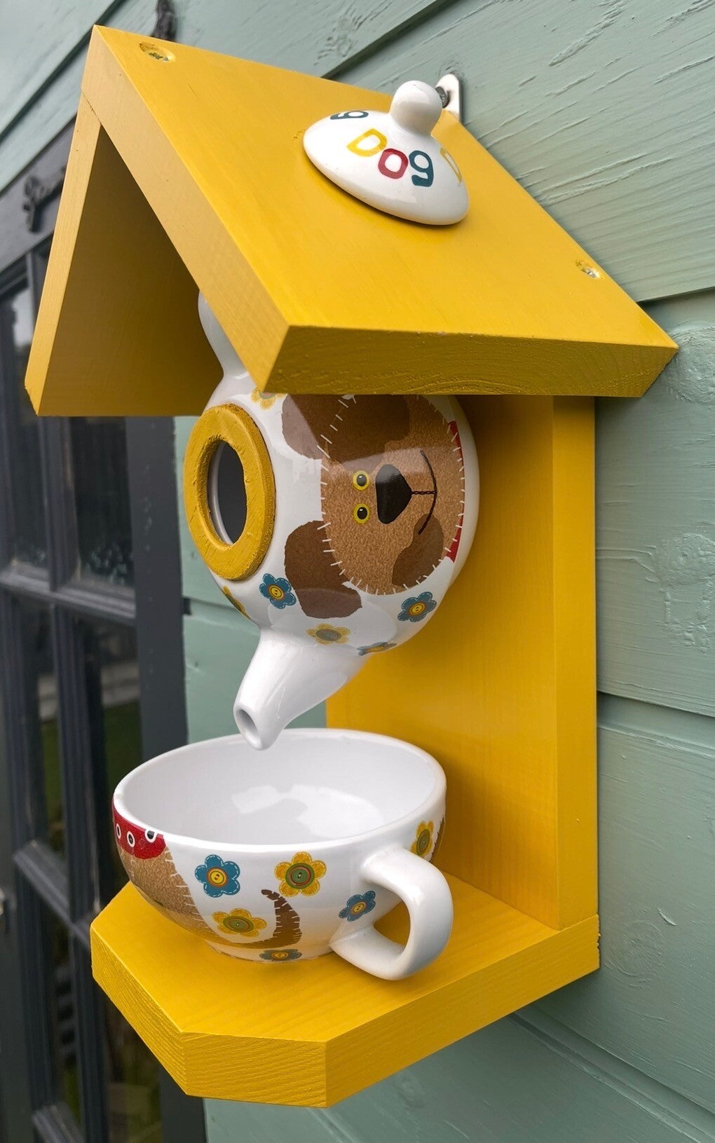 Featuring a dog themed teapot set with wood finished in a beautiful sundial paint colour creating a cozy retreat for birds and food from the cup.